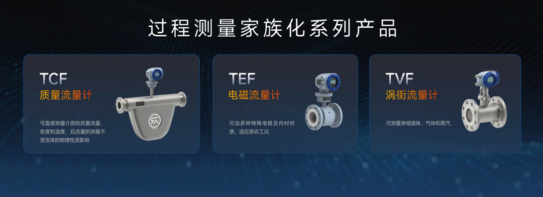 過程測(cè)量新產(chǎn)品:TCF質(zhì)量流量計(jì)、TEF電磁流量計(jì)、TVF渦街流量計(jì)。以“多場(chǎng)景適配、高精度覆蓋”為核心優(yōu)勢(shì),形成從常規(guī)壓力到超高壓、從氣體到液體的全產(chǎn)業(yè)鏈計(jì)量矩陣。